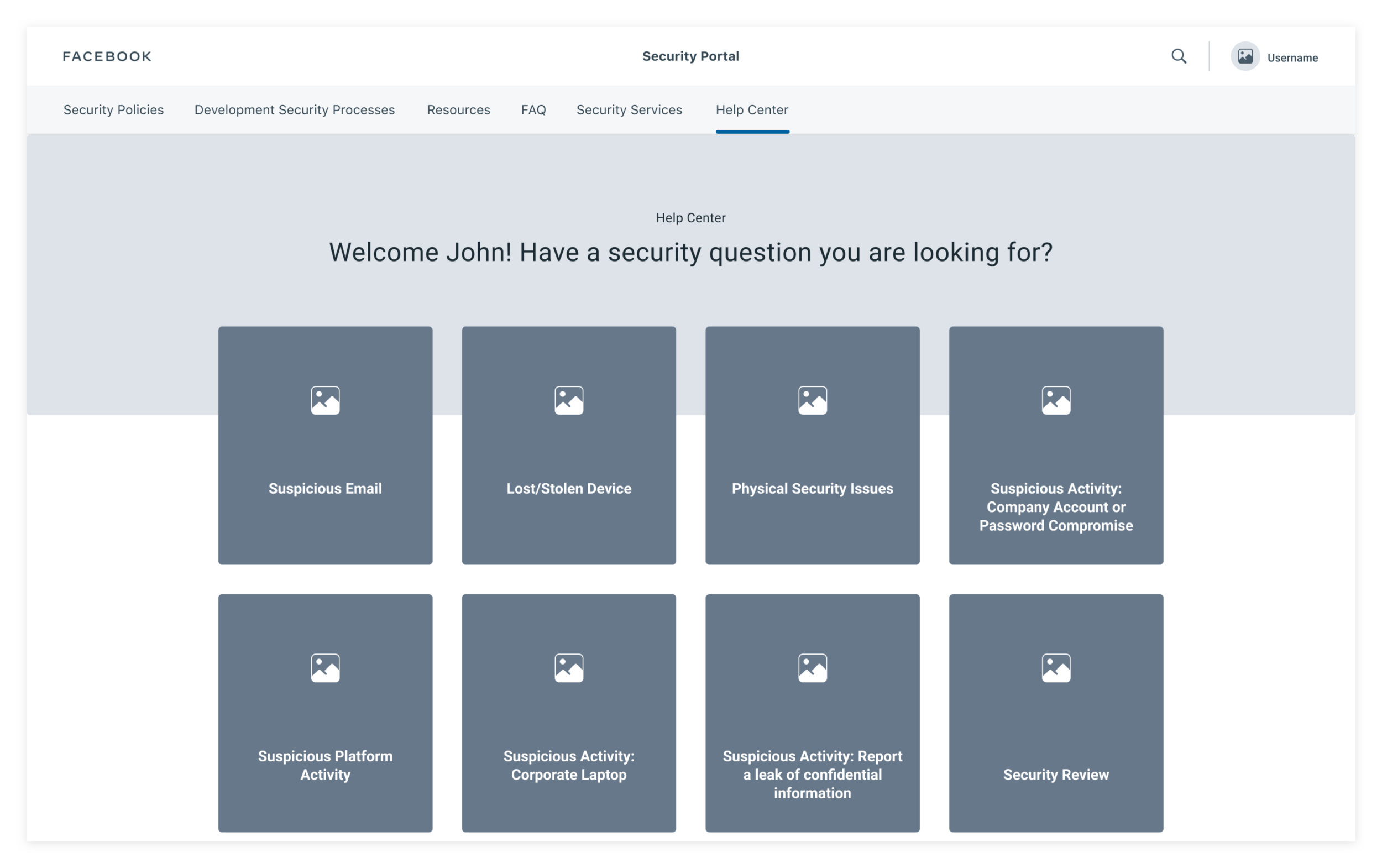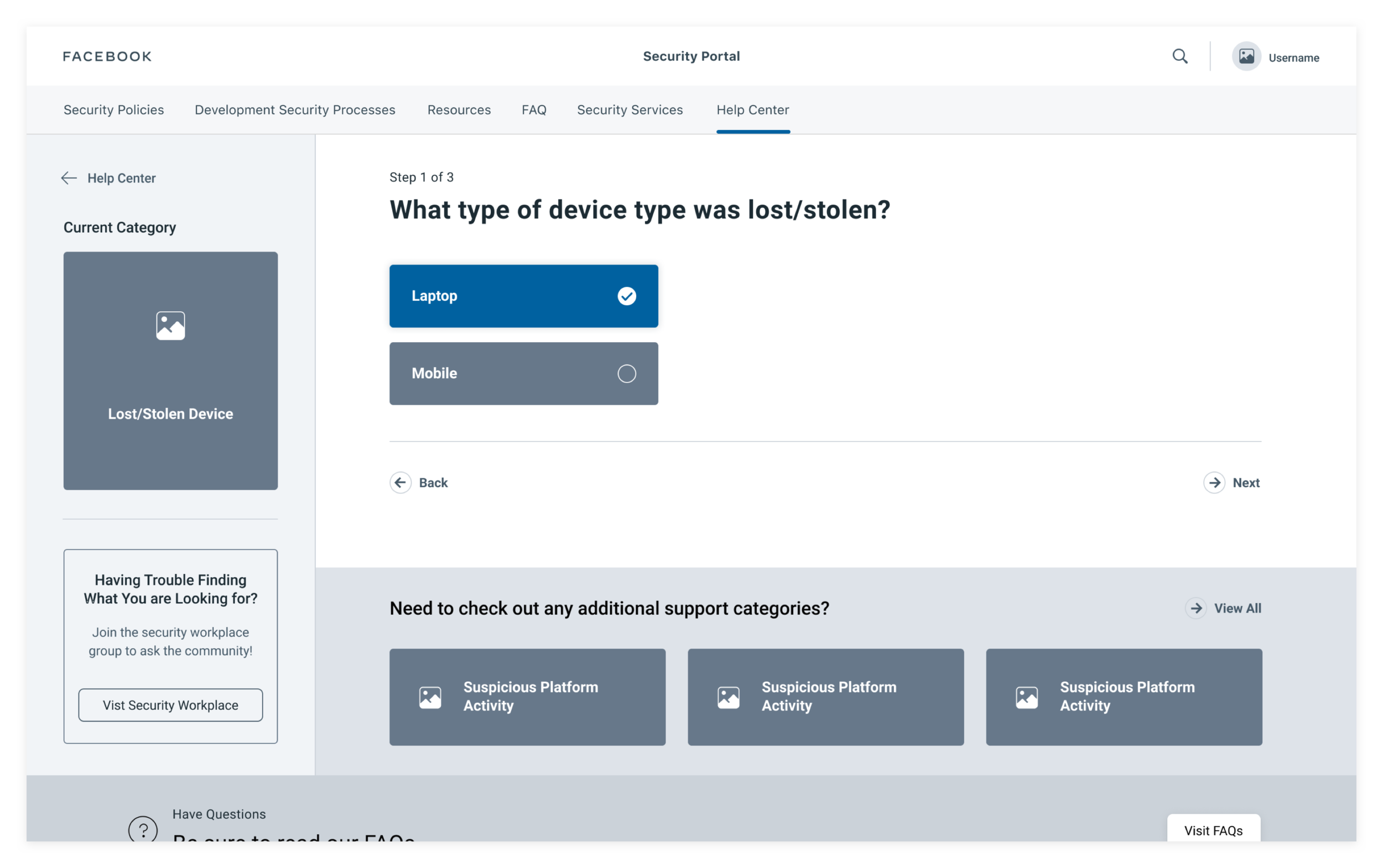 Meta needed a security portal to act as the hub for all things related to security. This portal needed to contain policies, security articles, walk through tutorials for developers, and it needed to encourage users to self support their questions related to security. I created a self guided walk-through “wizard” experience that would help navigate a user to content and articles that would support their questions, plus this same wizard experience would support collecting the necessary information the security team needed when a user is submitting a ticket.